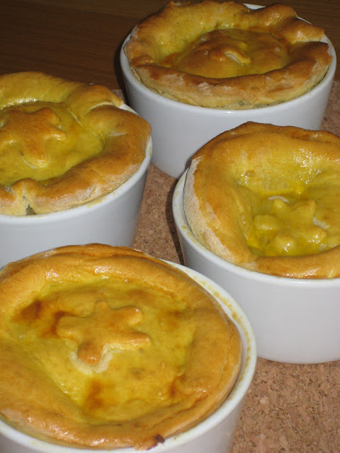 O meu desafio de hoje era o seguinte: o que fazer a um resto de frango assado? Tinha três opções: a primeira, pô-lo no lixo (um pecado, nos tempos que correm); a segunda, comê-lo assim mesmo (desinteressaaaaaaante); a terceira, fazer umas empadas, servidas em ramequins.  Adivinhem qual foi a minha opção…